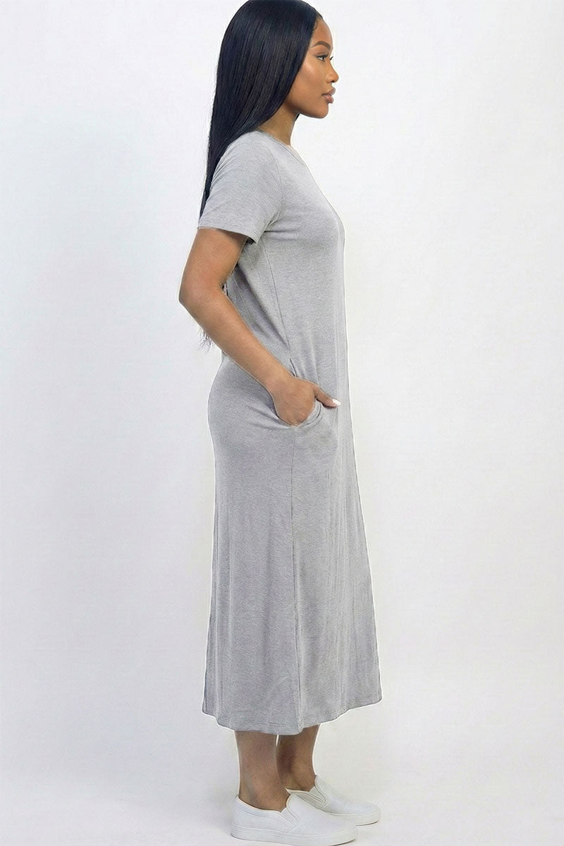 Elevate your casual wardrobe with this effortlessly stylish Side Pocket Tee Dress. Designed with a relaxed fit and a soft, stretchy fabric, this dress offers ultimate comfort while keeping you chic. Featuring functional side pockets and a midi-length silhouette, it's perfect for running errands, lounging, or dressing up with accessories for a casual outing. The crew neckline and short sleeves make it a versatile piece that pairs seamlessly with sneakers or sandals.